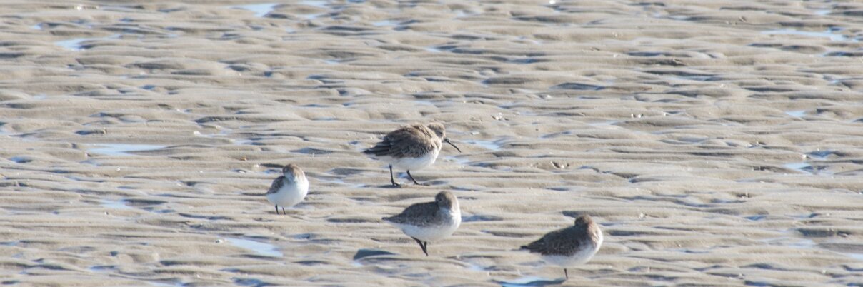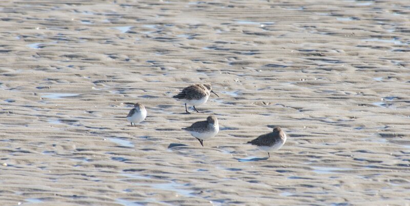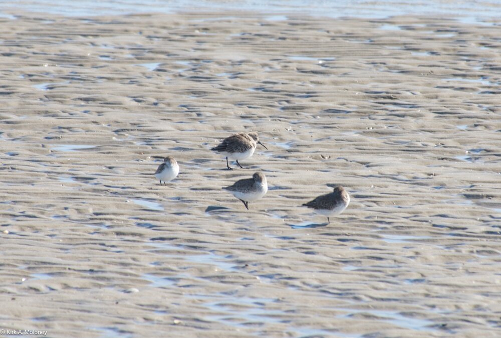 Three larger birds are Dunlins; smaller bird to left is either a Western Sandpiper or a Semipalmated Sandpiper